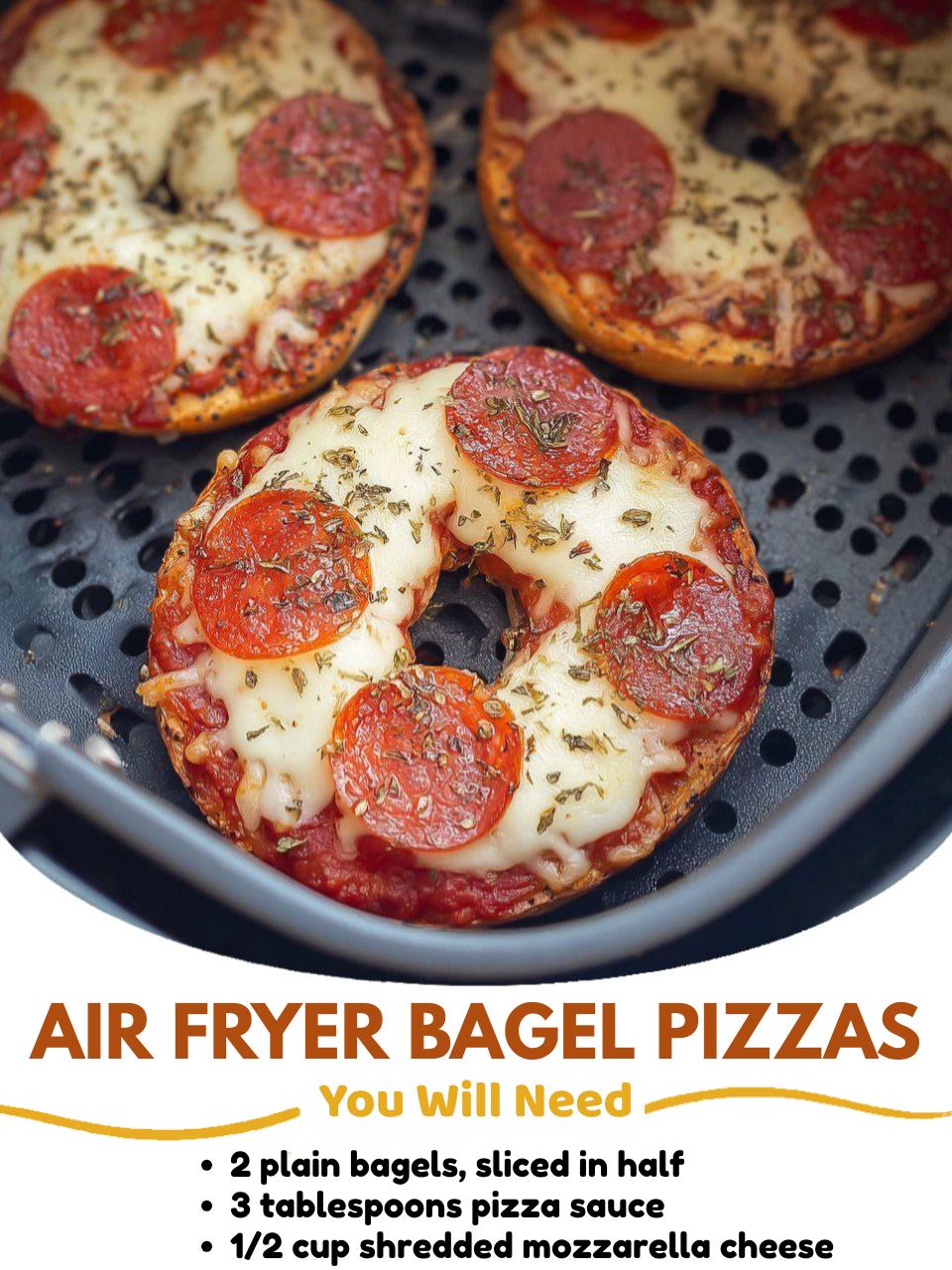These Air Fryer Bagel Pizzas are quick, crispy, and customizable — a fun twist on classic pizza that’s ready in minutes. Each toasted bagel half is topped with tangy pizza sauce, gooey mozzarella, and your favorite toppings, then air-fried to golden perfection. Perfect for an easy lunch, after-school snack, or casual dinner night.