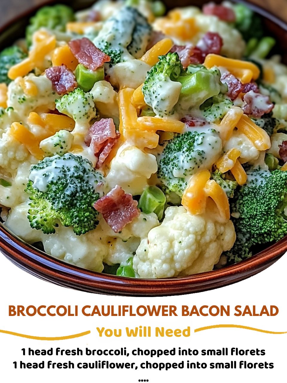 🥦🥓 Fresh, crunchy, and bursting with flavor — this Broccoli Cauliflower Bacon Salad is the perfect balance of crisp veggies, smoky bacon, and creamy dressing. Topped with cheddar cheese and a hint of sweetness, it’s a crowd-pleasing side dish that’s ideal for BBQs, potlucks, or any meal that needs a refreshing, savory crunch!