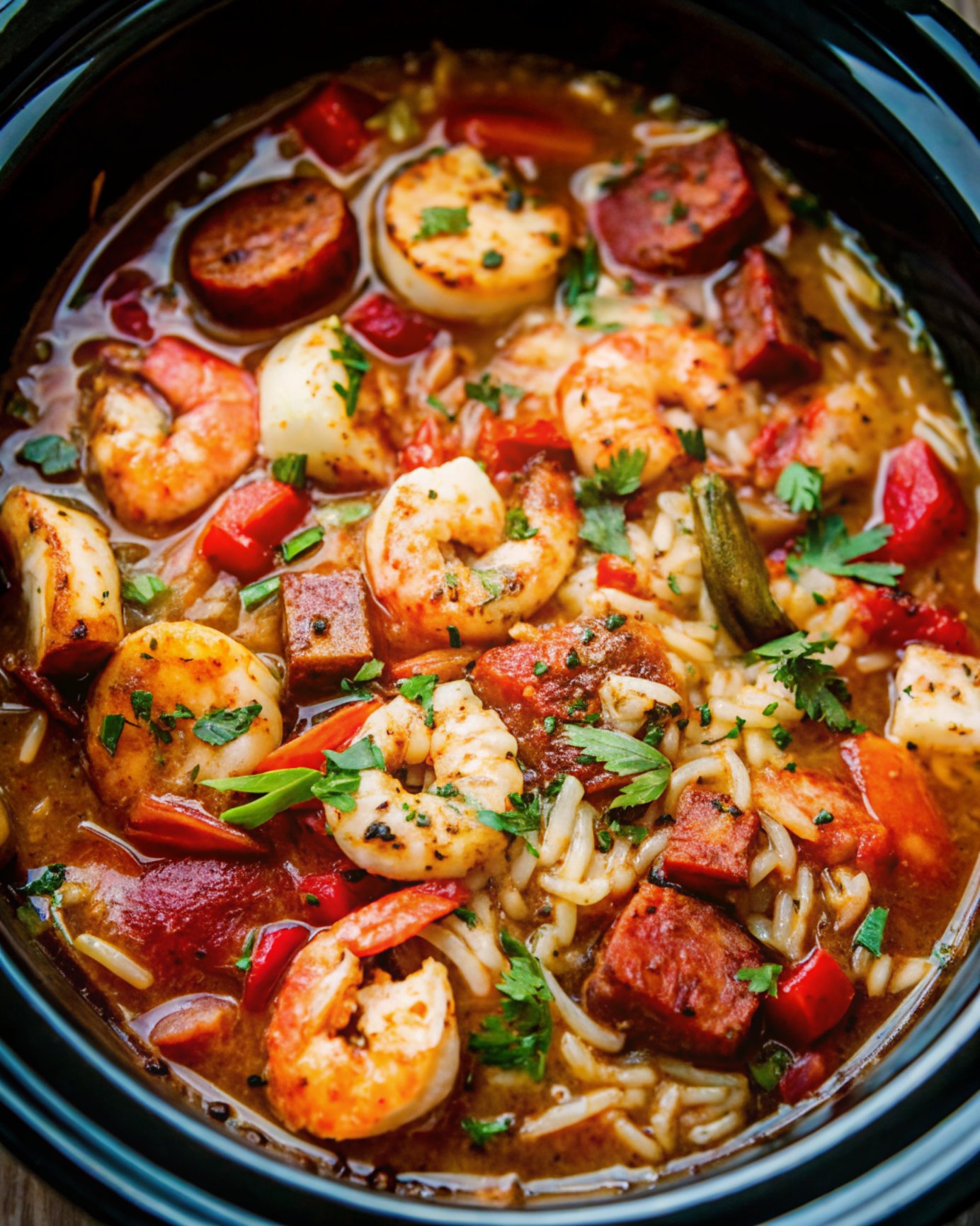 Slow Cooker Cajun Jambalaya with Chicken, Sausage & Shrimp