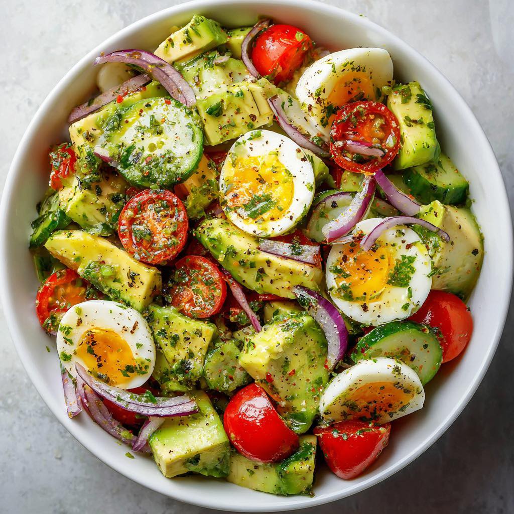 This vibrant and refreshing salad is packed with flavor and texture. With a base of fresh herbs, crunchy vegetables, and protein-rich eggs, it’s topped with a creamy avocado dressing that adds a smooth, rich finish.