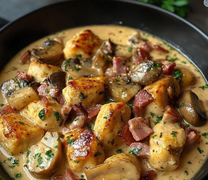 If you like comfort, creamy and tasty food, this chicken with mushrooms and bacon will quickly become a staple in your kitchen. With its creamy sauce, browned chicken chunks and the smoky scent of bacon, this dish is always a hit, whether it’s for a quick dinner or a family meal.