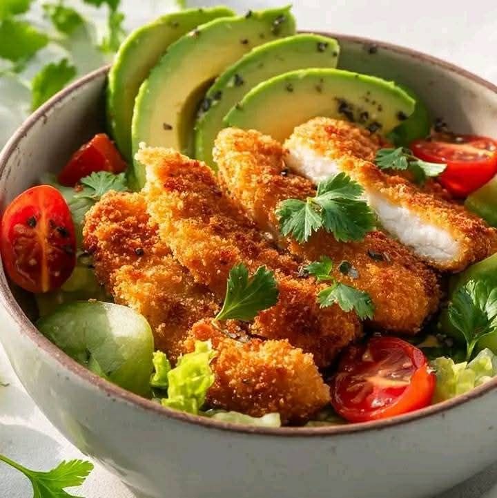 This Crispy Chicken & Avocado Salad is a vibrant, protein-packed dish featuring golden breaded chicken, creamy avocado, fresh vegetables, and a light lemon-honey dressing. It’s the perfect mix of textures and flavors — crisp, creamy, juicy, and zesty — making it ideal for a balanced lunch or light dinner.