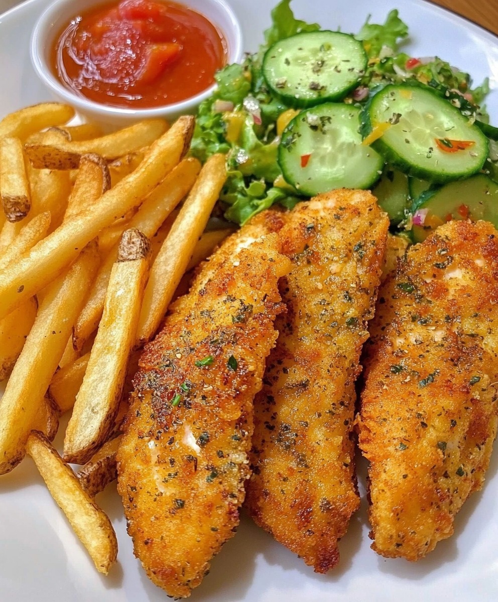 🥗✨ Crispy Herb Chicken Strips with Golden Fries & Fresh Garden Salad