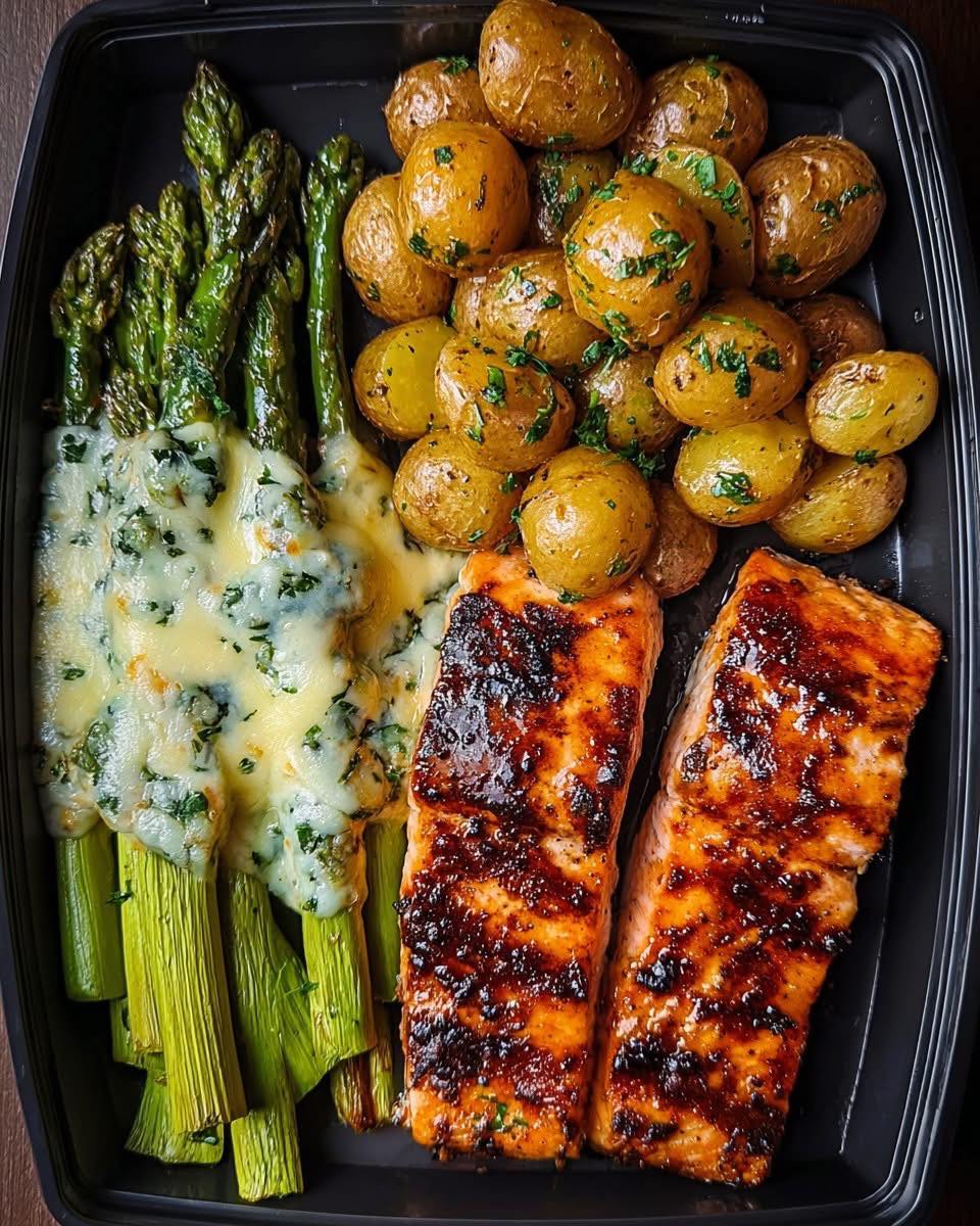 π§π₯ Glazed Salmon with Garlic Butter Potatoes & Cheesy Asparagus π§π