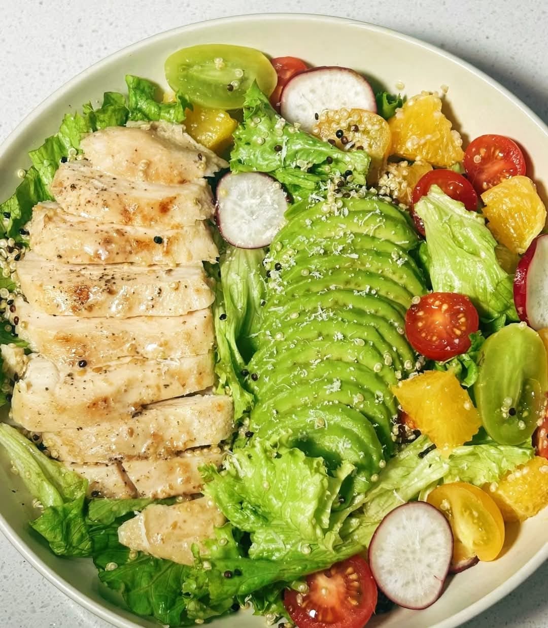 This Grilled Chicken Avocado Salad is a light and refreshing meal that’s packed with flavor and nutrients. The tender grilled chicken pairs perfectly with creamy avocado, crunchy radishes, and juicy cherry tomatoes, while a burst of citrus from orange and lemon juice adds a delightful twist. Topped with hemp or sesame seeds, this salad is not only delicious but also full of healthy fats and protein, making it the perfect dish for lunch or dinner.