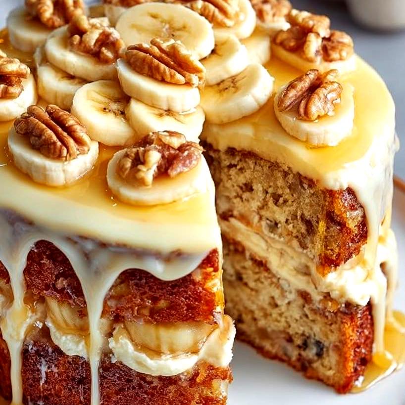 This Heavenly Banana Walnut Cream Cake is the ultimate dessert for banana lovers. With soft, moist banana cake layers infused with sour cream and cinnamon, it’s loaded with chopped walnuts for a nutty crunch and frosted with a light, fluffy cream cheese whipped frosting. Topped with sliced bananas, more walnuts, and a drizzle of honey or caramel, every bite delivers rich banana flavor with creamy, dreamy texture. Perfect for brunch, birthdays, or cozy weekend baking!