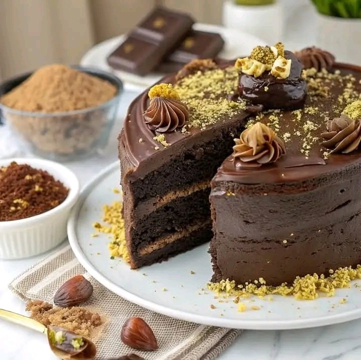 This ultra-moist chocolate cake is rich, fluffy, and deeply flavorful, thanks to buttermilk, hot coffee, and a lush cocoa base. It’s layered with silky dark chocolate ganache and finished with optional elegant garnishes like chopped dates, gold dust, or chocolate curls—ideal for celebrations or indulgent chocolate cravings.