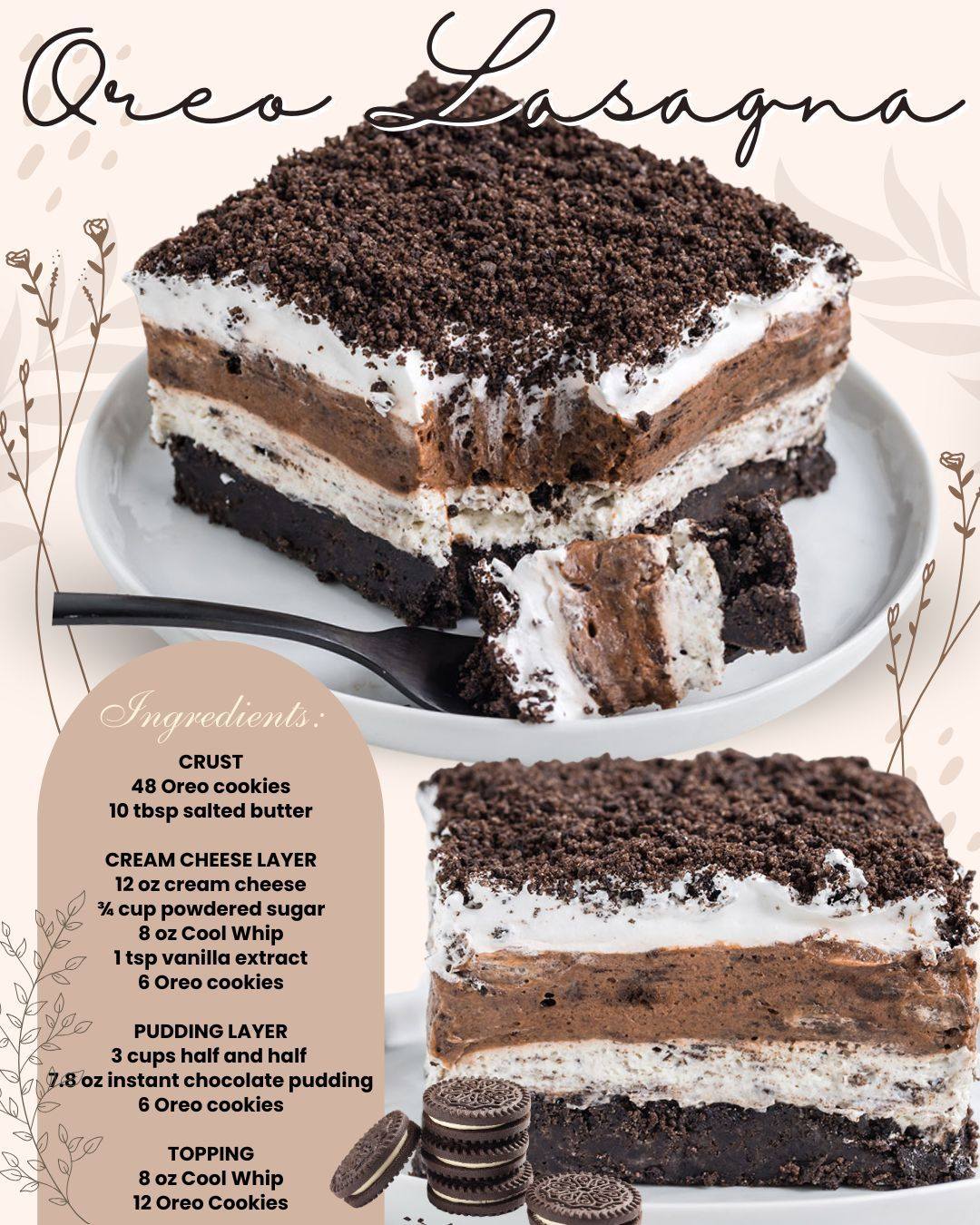 This indulgent no-bake Oreo Lasagna is layer upon layer of creamy, chocolatey, crunchy bliss! It’s the ultimate dessert for parties, holidays, potlucks—or anytime you want to wow a crowd with minimal effort. With a buttery Oreo crust, fluffy cream cheese layer, rich chocolate pudding, and a Cool Whip topping, every slice is guaranteed to disappear fast!