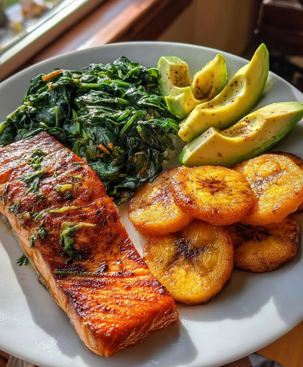 This Pan-Seared Salmon with Fried Plantains, Garlic Spinach & Avocado is a Caribbean-inspired plate bursting with vibrant colors and flavors. The crispy golden plantains, creamy avocado, garlicky spinach, and perfectly seared salmon come together for a nourishing, balanced meal that feels indulgent yet wholesome. 🌴🐟🥑