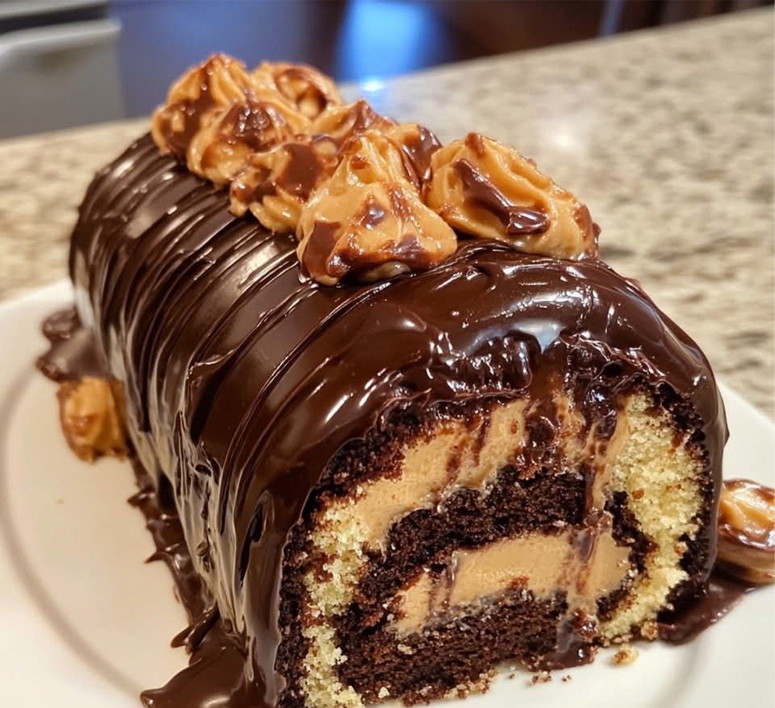 This Peanut Butter Cup Chocolate Roll Cake is a showstopping dessert featuring a fluffy chocolate sponge rolled with rich peanut butter cream and studded with mini peanut butter cups. Topped with a glossy ganache, it’s a Reese’s-lover’s dream come true!