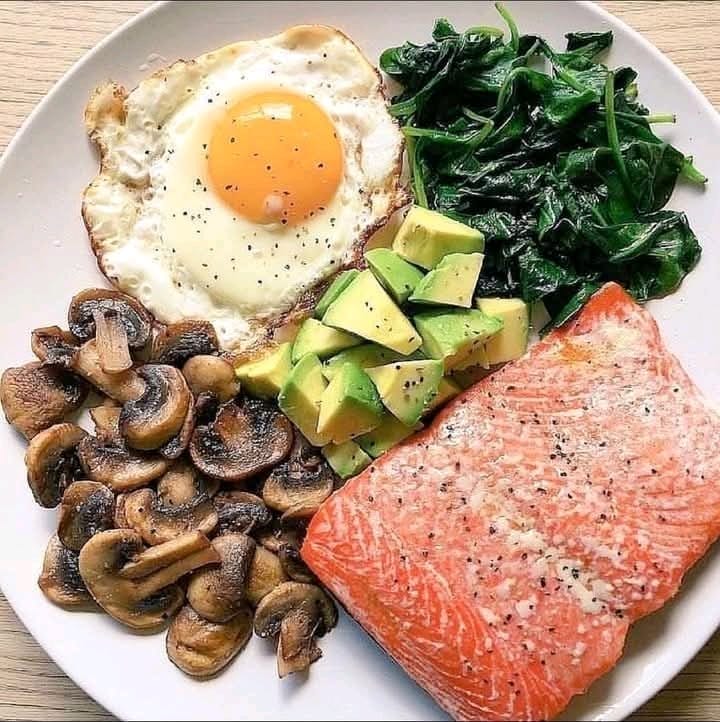 Fuel your day with this vibrant, clean, and satisfying breakfast featuring pan-seared salmon, sautΓ©ed mushrooms and spinach, avocado chunks, and a perfectly fried egg.