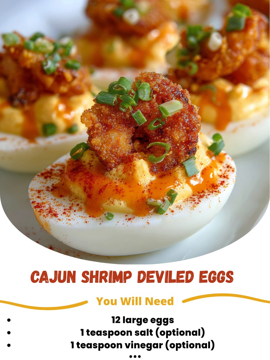 Creamy egg filling topped with seasoned Cajun shrimp and green onions for bold, vibrant flavor.