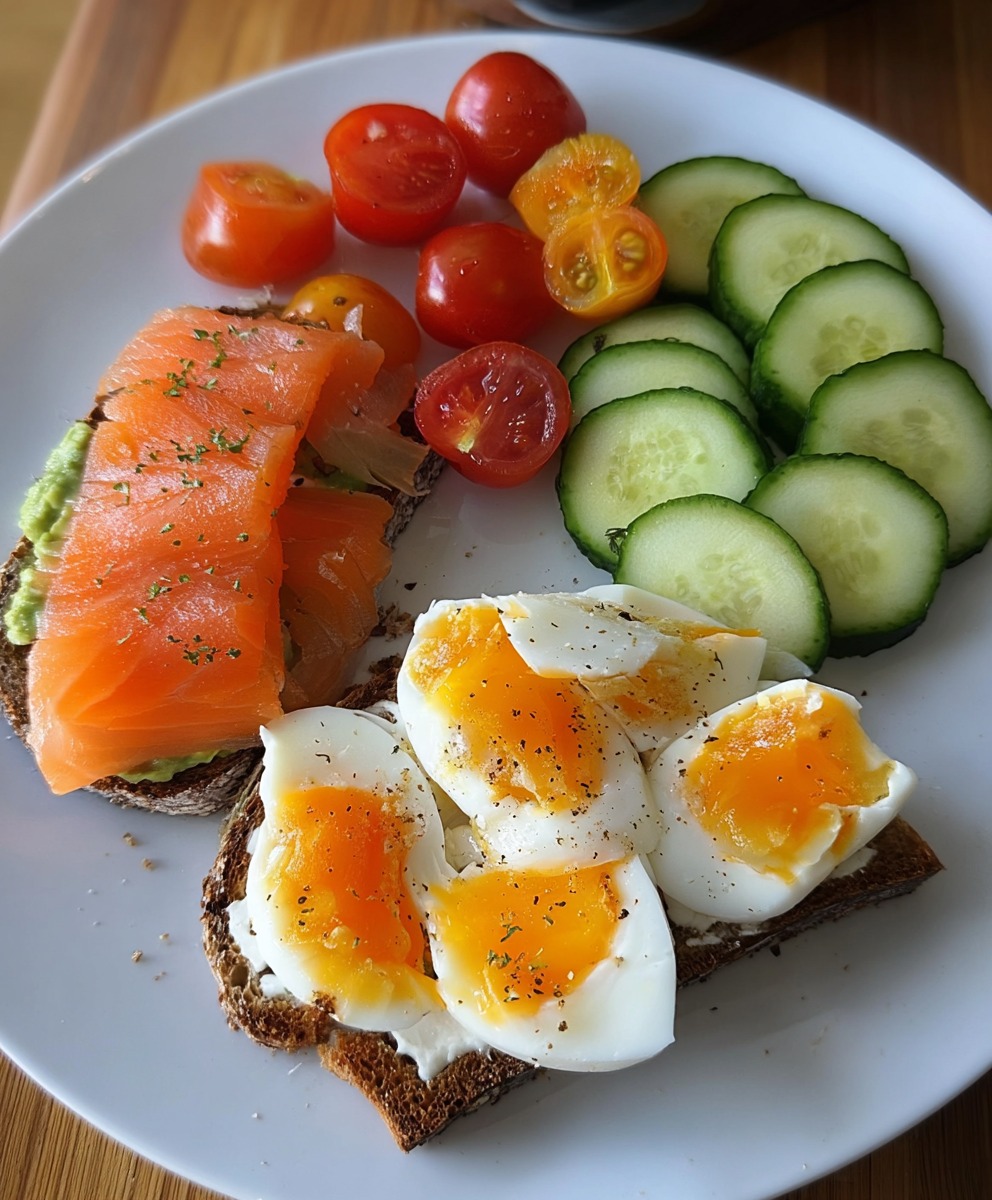 🥑🍅 Fresh, protein-packed, and delightfully satisfying — this Smoked Salmon & Avocado Toast with Soft-Boiled Eggs is a simple yet elegant breakfast (or brunch) that’s as nourishing as it is beautiful. Creamy avocado and rich smoked salmon sit atop crisp whole-grain toast, paired with perfectly soft-boiled eggs, juicy cherry tomatoes, and crisp cucumber for a fresh, balanced plate that feels like a café meal at home.
