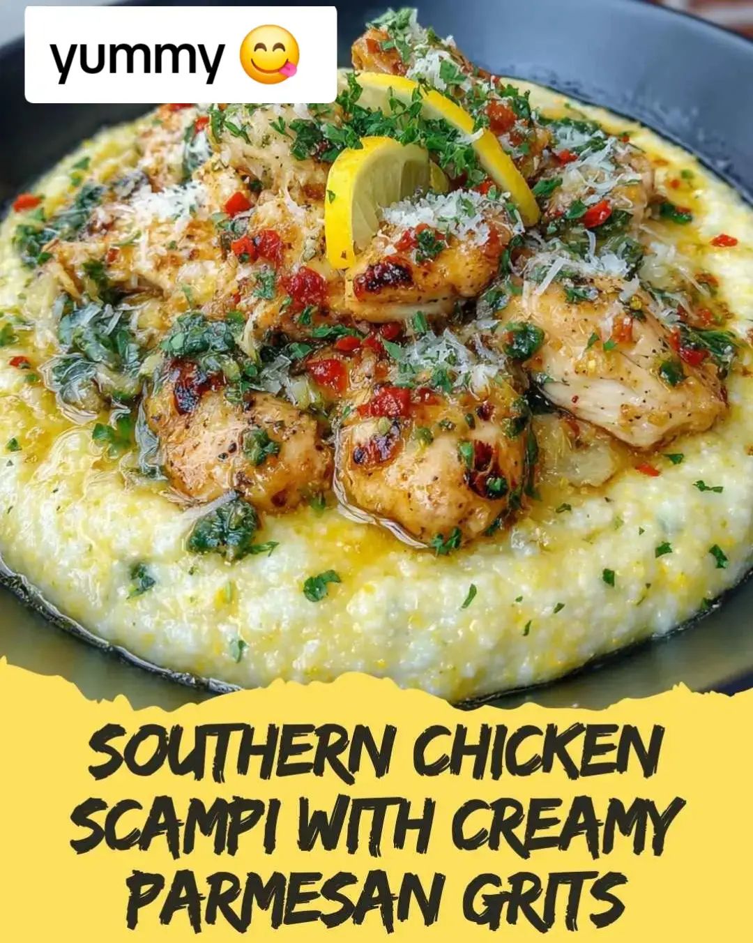 This comforting Southern Chicken Scampi with Creamy Parmesan Grits blends bold garlic, bright lemon, and tender chicken with silky, buttery grits for a satisfying dish that’s both rustic and elegant. It’s a fusion of classic scampi with soulful Southern flavors, perfect for weeknights or entertaining.
