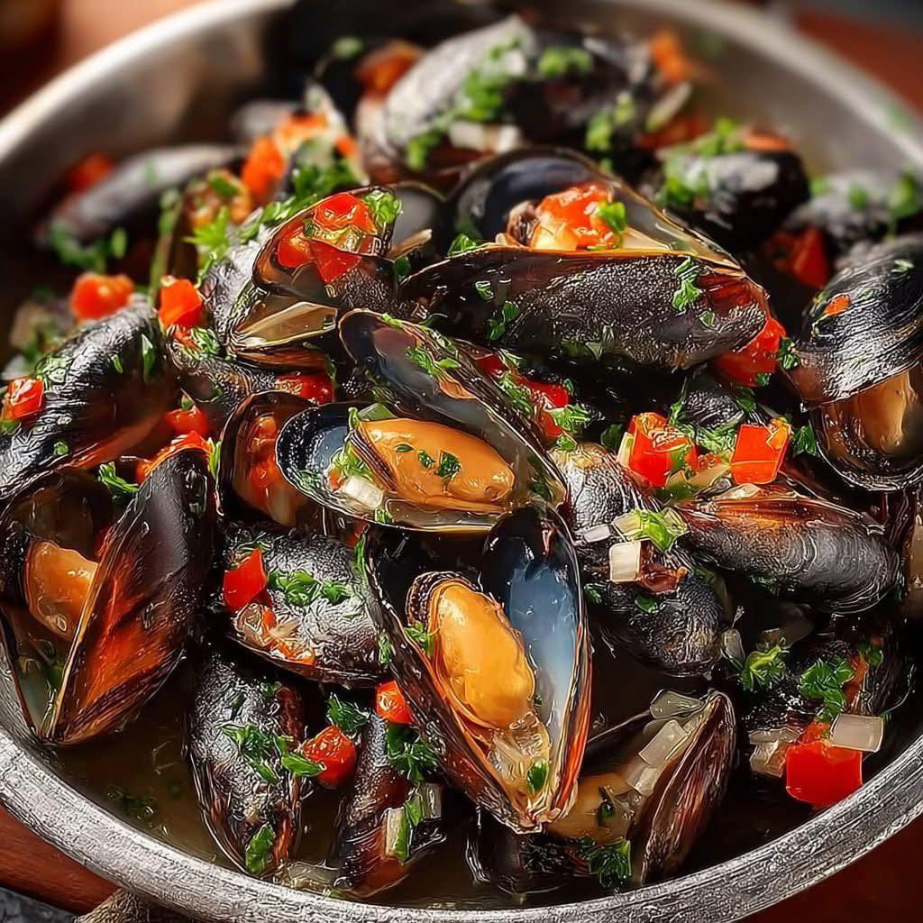Steamed Mussels in Garlic Butter Sauce is a coastal classic — tender, briny mussels cooked gently in a rich, aromatic blend of garlic, butter, olive oil, and dry white wine. Accented by the sweetness of red bell pepper and onion, the mussels are steamed just until they open, locking in their delicate flavor. Finished with a sprinkle of fresh parsley and a squeeze of lemon, this dish is as simple as it is elegant — and best enjoyed with toasted bread to soak up every last spoonful of the garlicky broth.