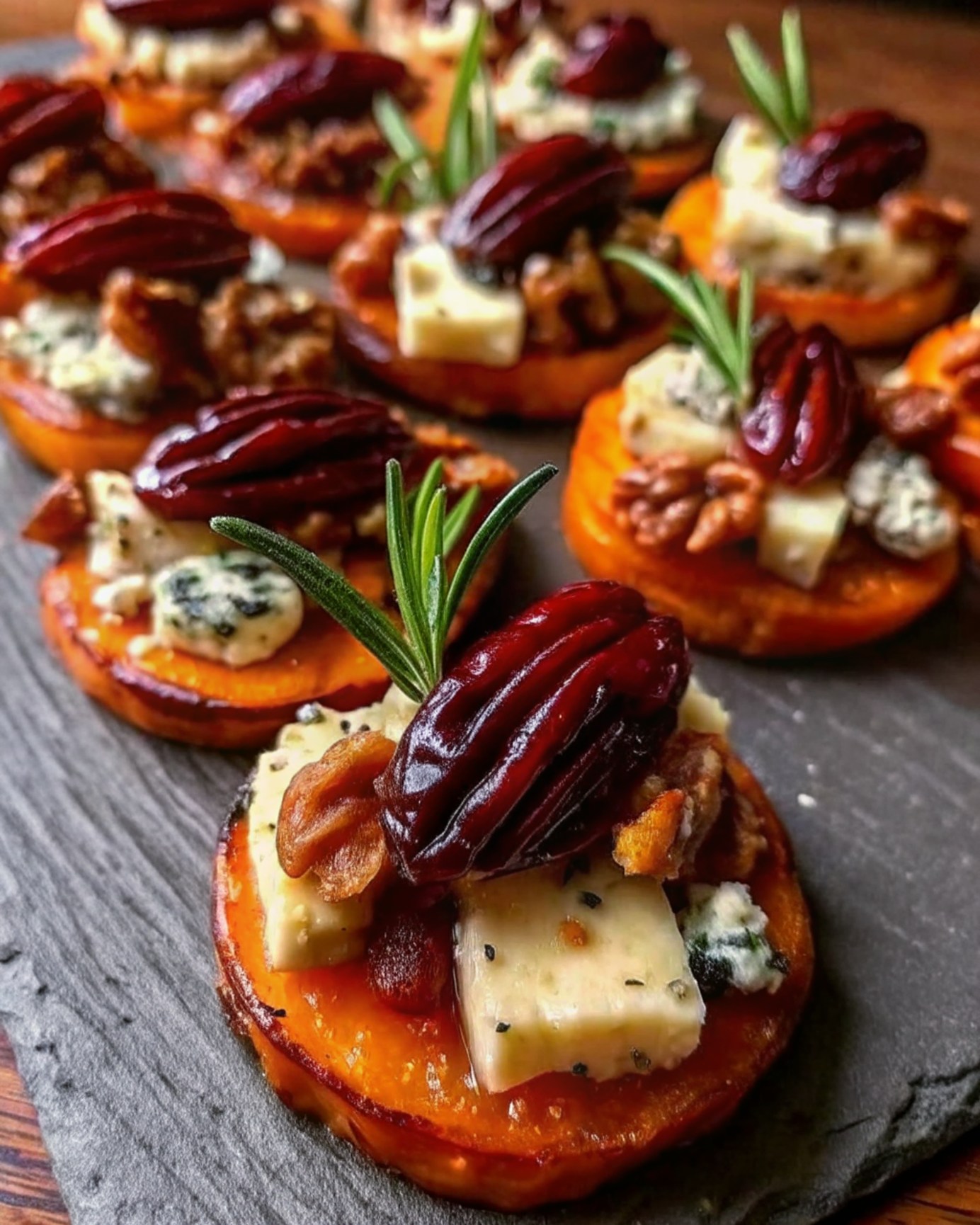 These roasted sweet potato rounds topped with creamy blue cheese, tart cranberries, and crunchy pecans are the ultimate festive appetizer—sweet, salty, and totally stunning.