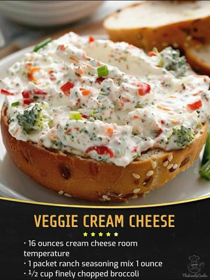 This Veggie Cream Cheese is the ultimate creamy, savory, and colorful spread that adds a fresh twist to your morning bagel or afternoon snack! Packed with finely diced veggies and a punch of flavor from ranch seasoning, this spread is perfect for dipping, spreading, or even stuffing into wraps and pinwheels. It’s easy to make ahead and keeps well in the fridge, making it a go-to for meal prep or entertaining. 🥕🌶️🥦